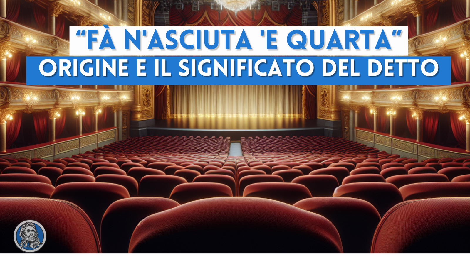 Il proverbio “fà n’asciuta ‘e quarta” nasce originariamente nell’ambito teatrale. L’attore che fa questo tipo di uscita è colui che fa il suo ingresso in scena dicendo la propria battuta a gran voce, senza modularla, quasi strillando. In questo modo, l’attore può esser sentito, senza alcuno sforzo di udito, dagli spettatori seduti nei palchi di quarta fila, molto lontani dal palcoscenico.