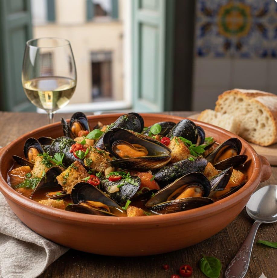 La zuppa di cozze (non gli spaghetti a vongole!) è il piatto tipico dei giorni precedenti la Pasqua, nllo specifico al rientro dalla Visita ai Sepolcri e di quello che un tempo era il così detto struscio a Toledo.